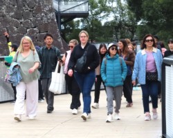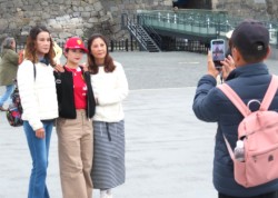 熊本城を背景に記念写真を写る外国人女性の団体客