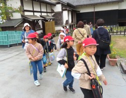 天守閣広場に続々とやって来る小学生たち