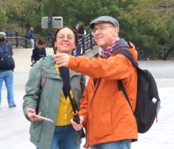 東洋人らしい女性を、体を斜めにして撮影する欧米人男性(右)