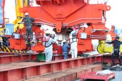 台船から陸揚げされ所定のレールに据え付けられる新クレーン